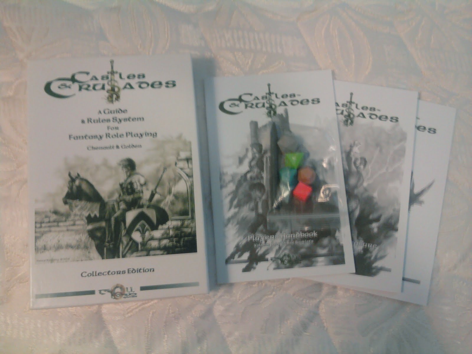 I got sick of waiting for my copy of the Swords & Wizardry: WhiteBox to be delivered so I picked up a copy of the Castles & Crusades:Collectors Edition boxed set from Troll Lord Games. So far I like it - a lot. I will reserve final judgement on the rules until I get to conduct an actual playtest, but at first glance they are a masterful example of concise writing. You get a rules set that looks and feels like old school D&D, but is much more unified with the addition of the SIEGE system. I can't believe I hadn't picked this set up until now!